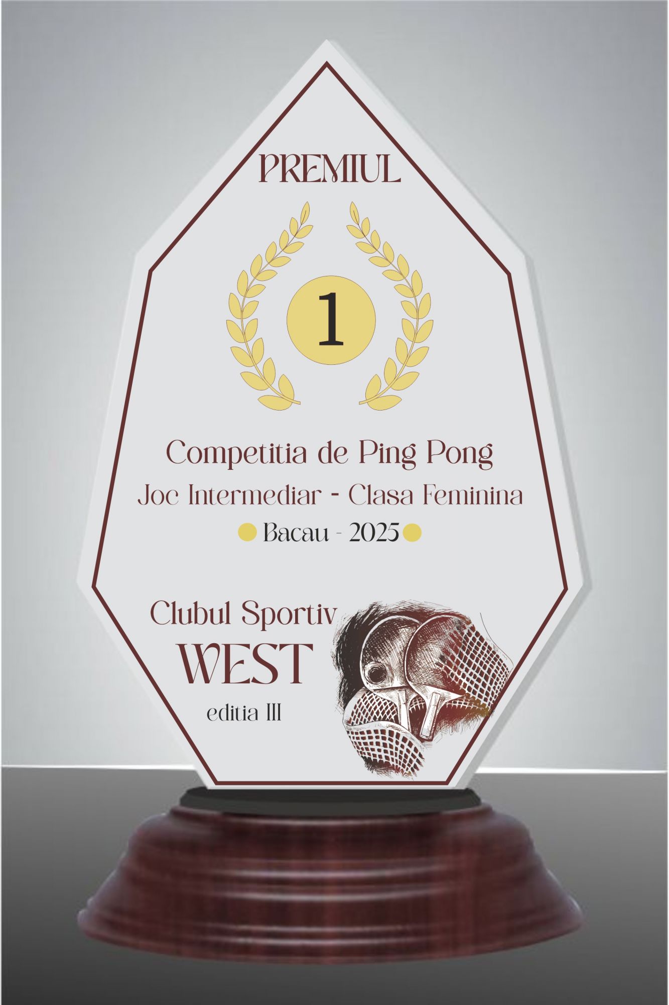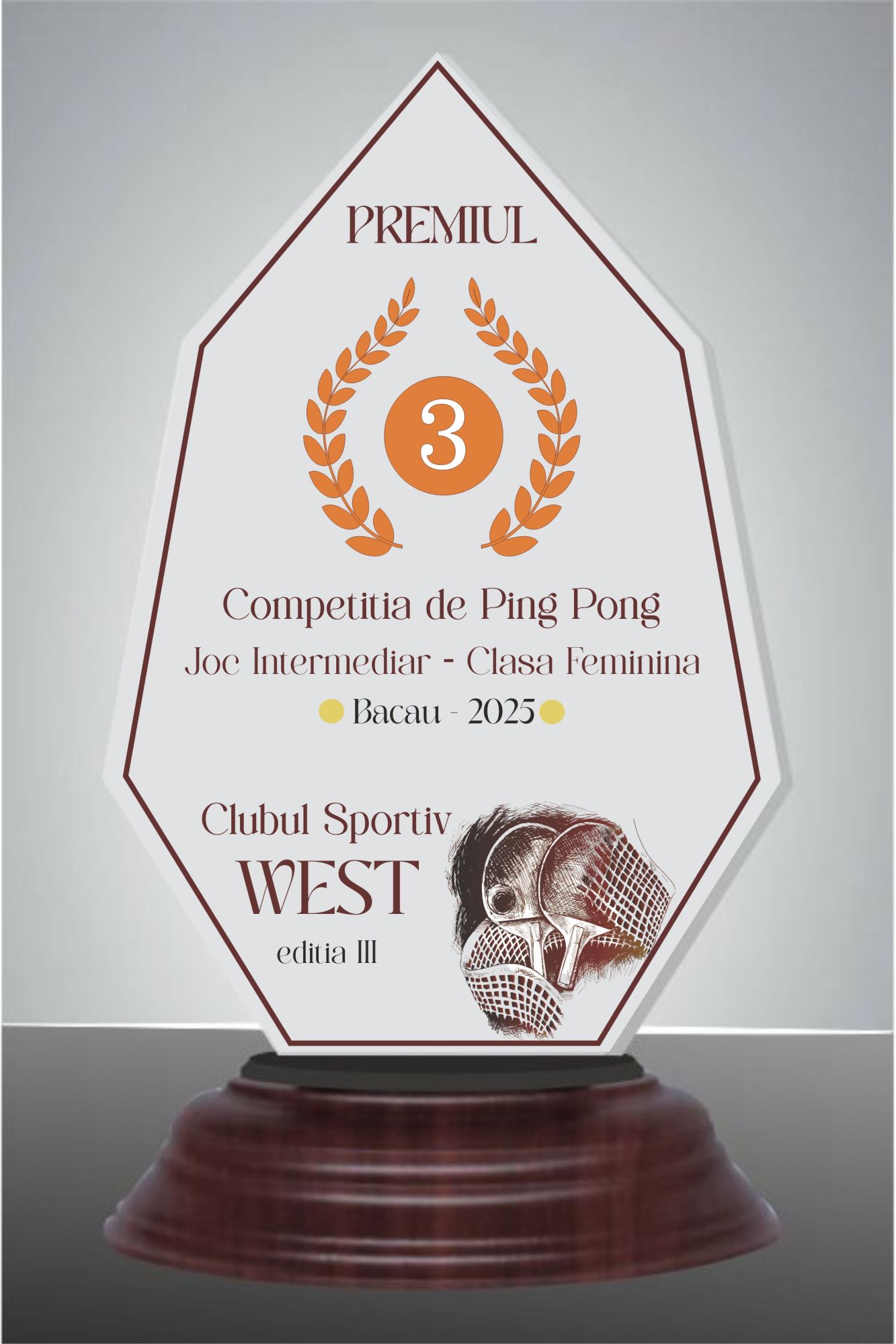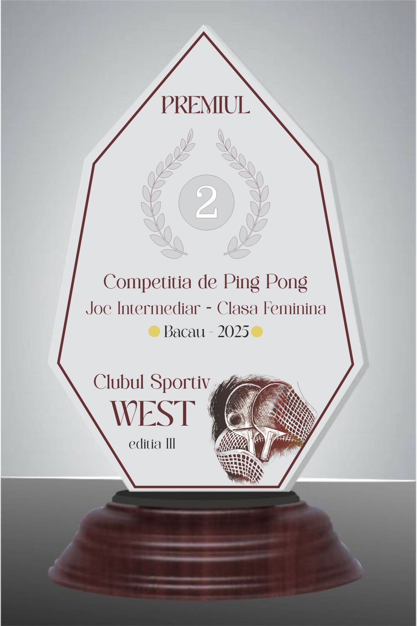 Trofeu premium din sticla acrilica de 10 mm grosime, extrem de elegant, șlefuit cu freze diamantate la diverse unghiuri, marginea lui fiind una stralucitoare, reflectând rezultatele exceptionale a persoanelor care vor primi acest trofeu.